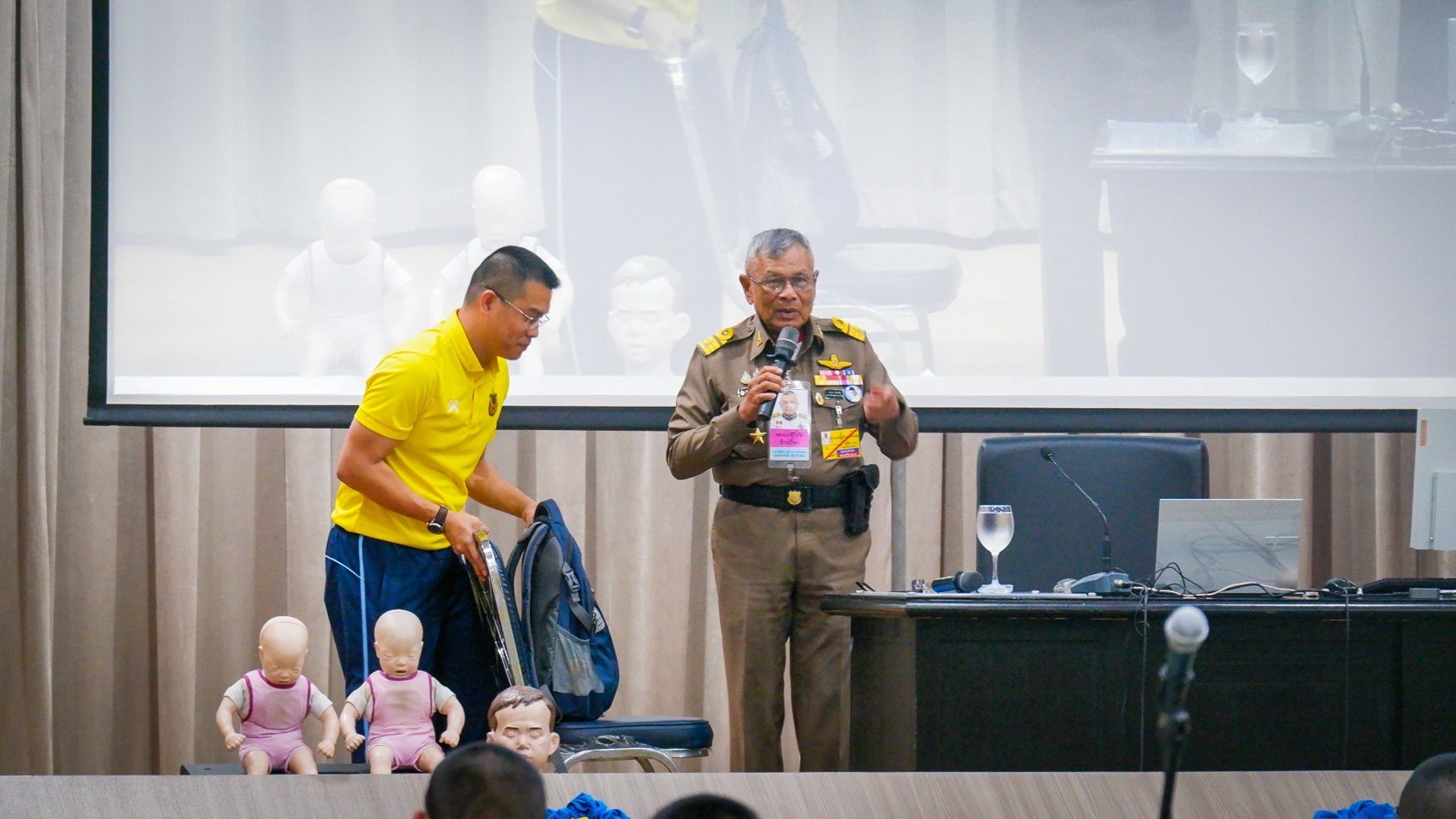 พลอากาศเอก สุบิน ชิวปรีชา กรมวังผู้ใหญ่ในพระองค์ รองผู้อำนวยการศูนย์อำนวยการใหญ่จิตอาสาพระราชทาน และคณะ ให้เกียรติเป็นผู้บรรยายพิเศษเรื่อง “การปฏิบัติการกู้ชีพพื้นฐาน Basic Life Support (CPR AED Choking)” และการฝึกอบรมการปฏิบัติ ให้กับนายทหารนักเรียน โรงเรียนเสนาธิการทหารอากาศ กรมยุทธศึกษาทหารอากาศ รุ่นที่ ๖๙ โดยมี พลอากาศตรี วิสูตร อินทร์ขำ ผู้บัญชาการโรงเรียนเสนาธิการทหารอากาศ กรมยุทธศึกษาทหารอากาศ ให้การต้อนรับ เมื่อจันทร์ที่ ๒๔ มีนาคม ๒๕๖๘ ณ ห้องบรรยาย โรงเรียนเสนาธิการทหารอากาศ กรมยุทธศึกษาทหารอากาศ การบรรยายครั้งนี้มีวัตถุประสงค์เพื่อให้นายทหารนักเรียนมีความตระหนักรู้ และมีทักษะในการปฏิบัติการกู้ชีพพื้นฐาน